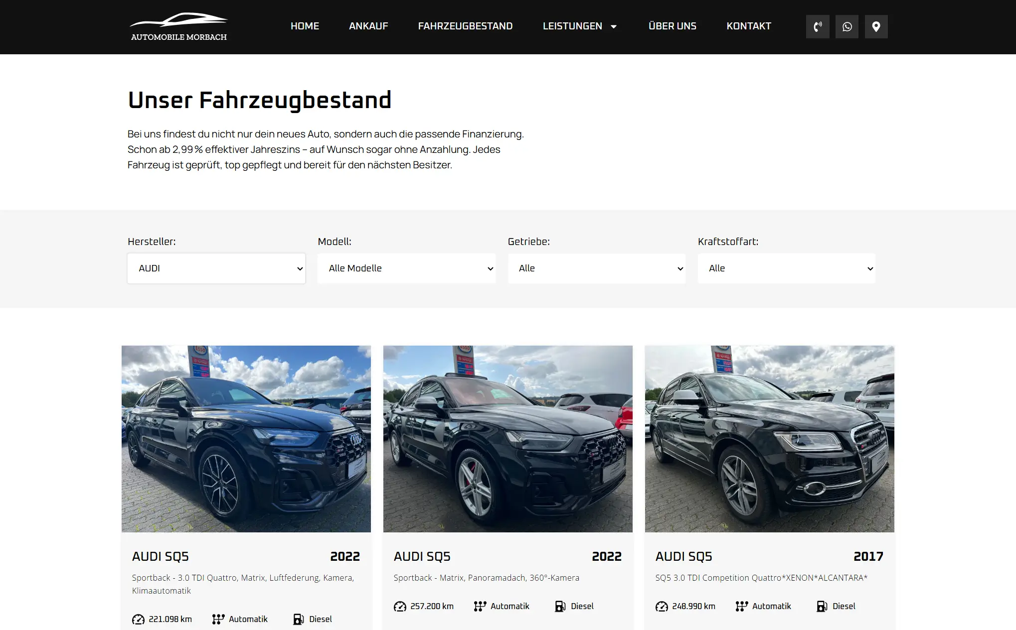 AutoAlex ist in den sozialen Medien stark präsent und bekannt für unkomplizierte Fahrzeugabwicklung. Unser Ziel: Eine Website, die diese Energie widerspiegelt – modern, professionell und markengerecht. Der Fokus lag auf Ankauf und Verkauf, ergänzt durch Features wie einen Transport-Service und einen Finanzierungsrechner für maximale Nutzerfreundlichkeit.